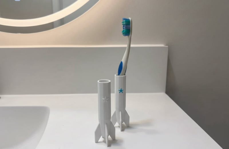 A fun and functional rocket-shaped holder designed to keep your toothbrush upright, clean, and stylish. Inspired by a minimal futuristic design, this 3D-printed accessory adds a unique accent to your bathroom.